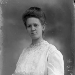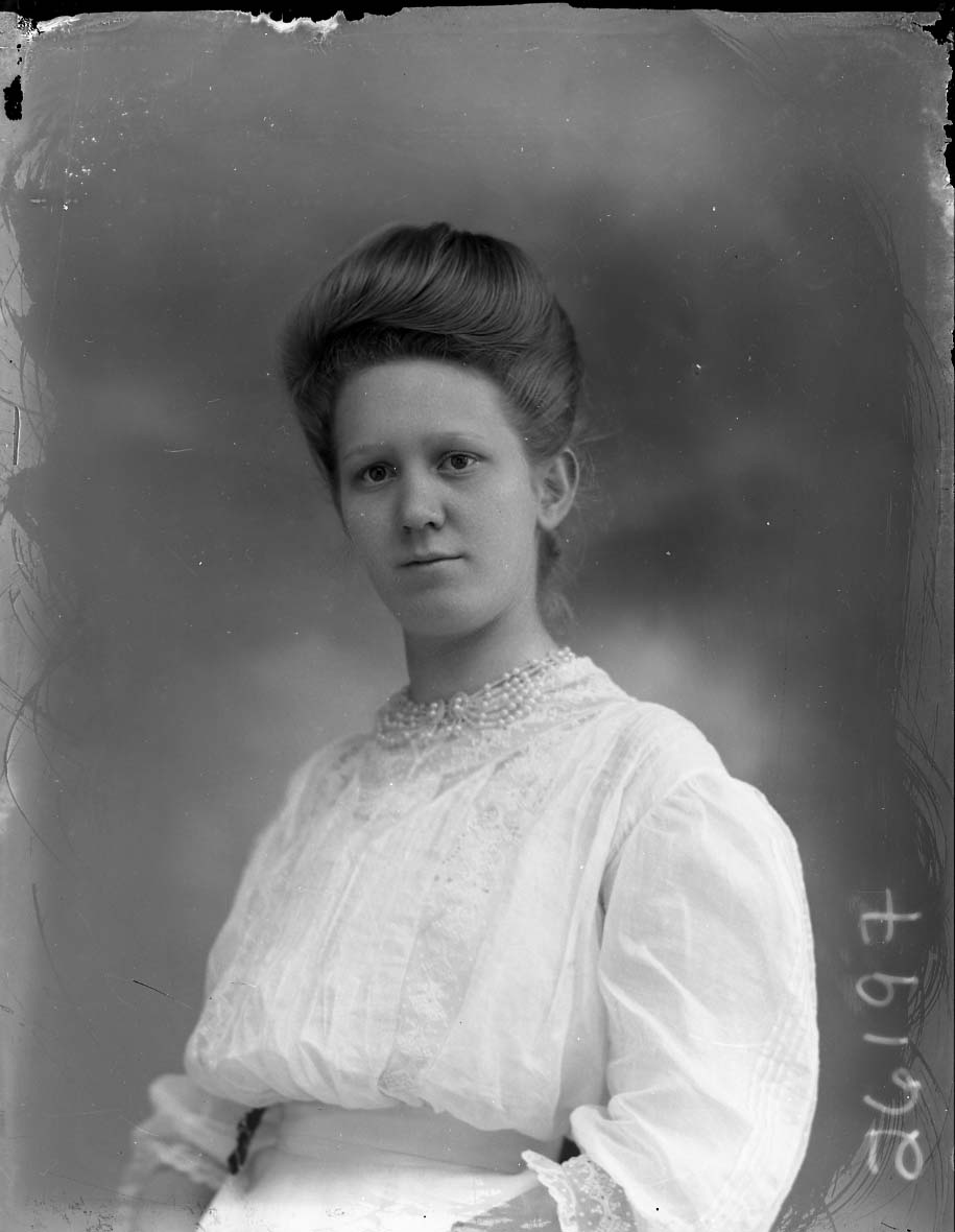 Portrait photograph of an unidentified woman with her hair pulled up.