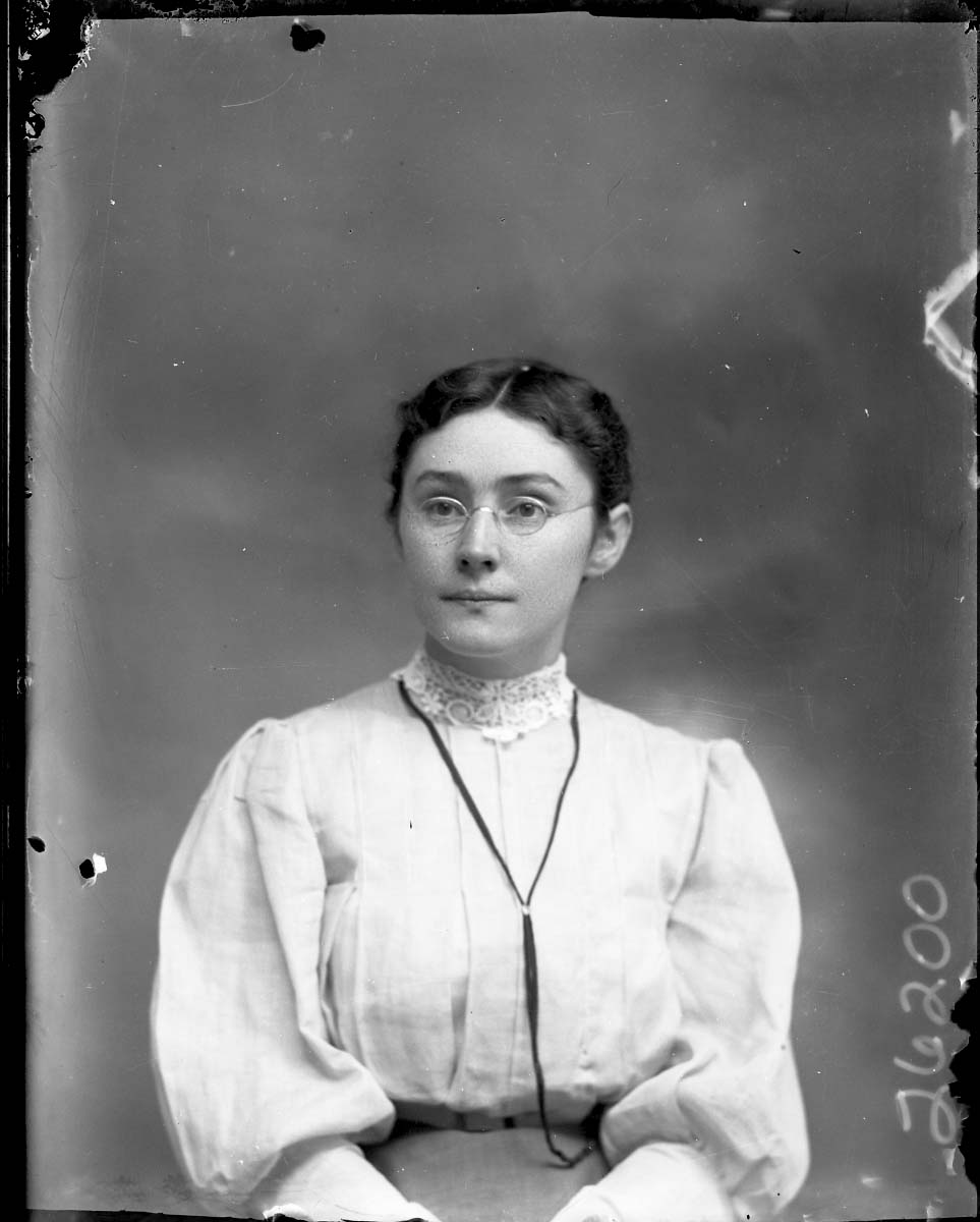 Portrait photograph of an unidentified woman with glasses and her hair pulled back and parted in the middle.