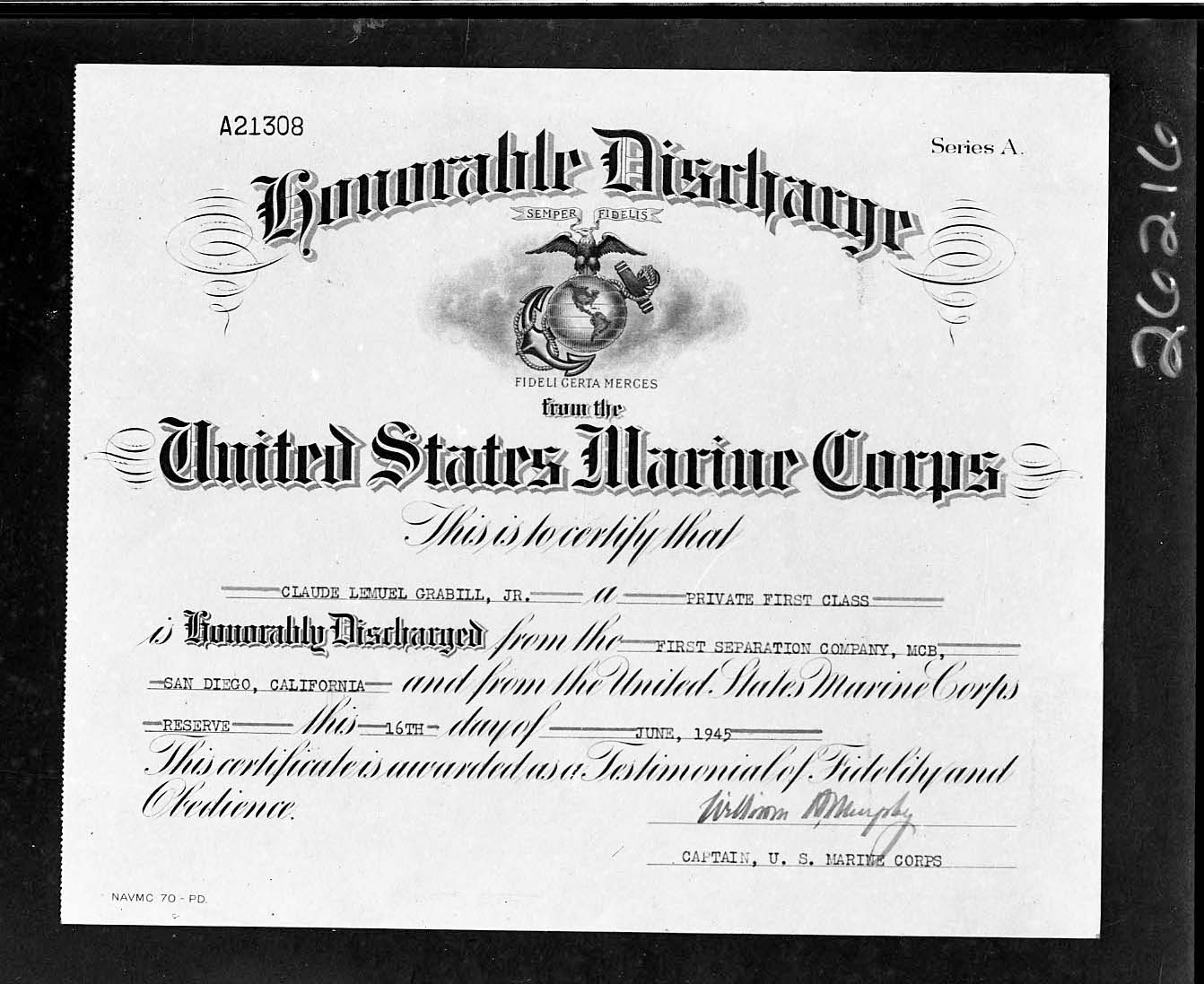 Claude Lemuel Crabill, Jr.'s USMC Discharge Certificate