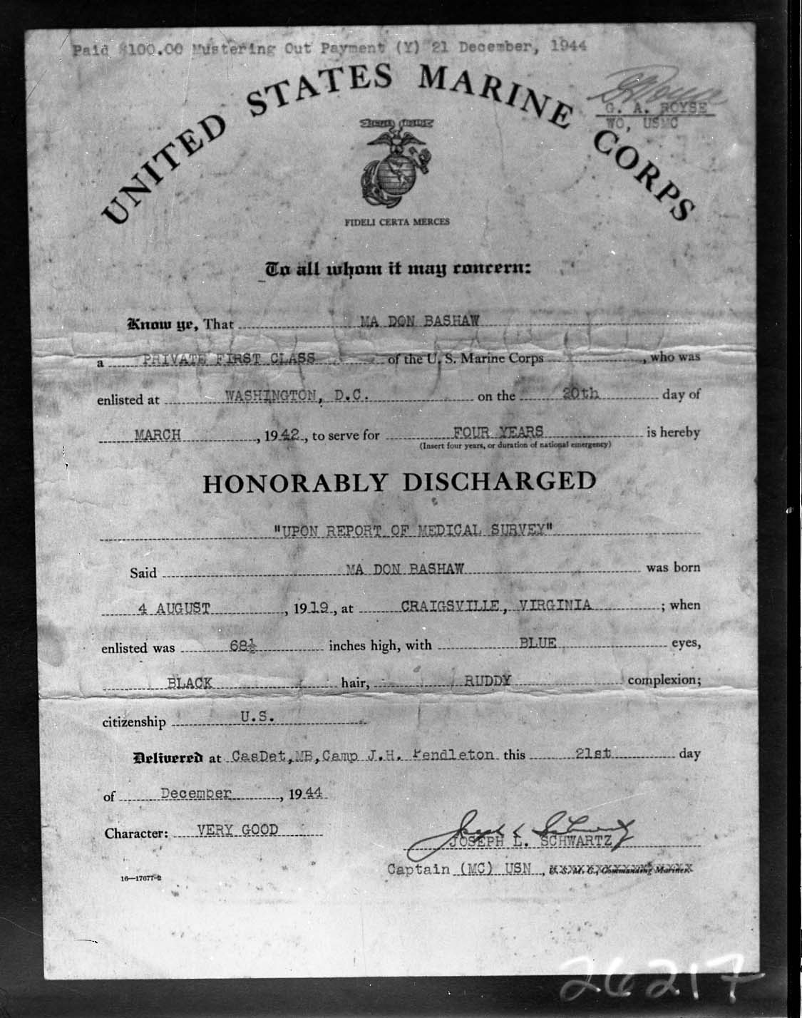 Morrison Studio, “Ma Don Bashaw's USMC Discharge Paperwork,” Shenandoah County Library Archives, accessed December 5, 2025, https://archives.countylib.org/items/show/55889.
