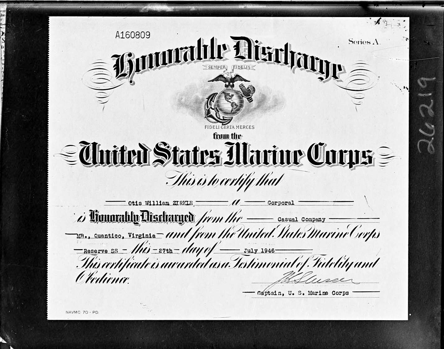 Photograph of the document certifying that Corporal Otis William Zirkle was honorably discharged from the U.S. Marine Corps in Quantico, Virginia, on July 27, 1946.