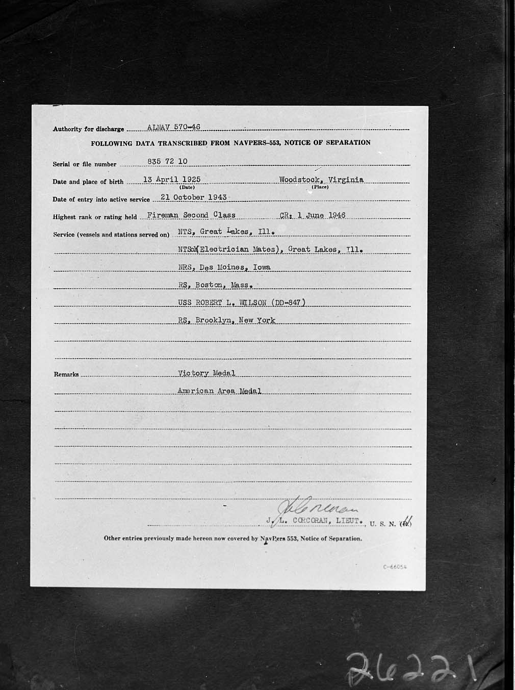 Morrison Studio, “David Milton Wolverton Jr.'s Naval Separation Form,” Shenandoah County Library Archives, accessed December 5, 2025, https://archives.countylib.org/items/show/55893.