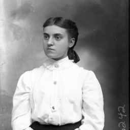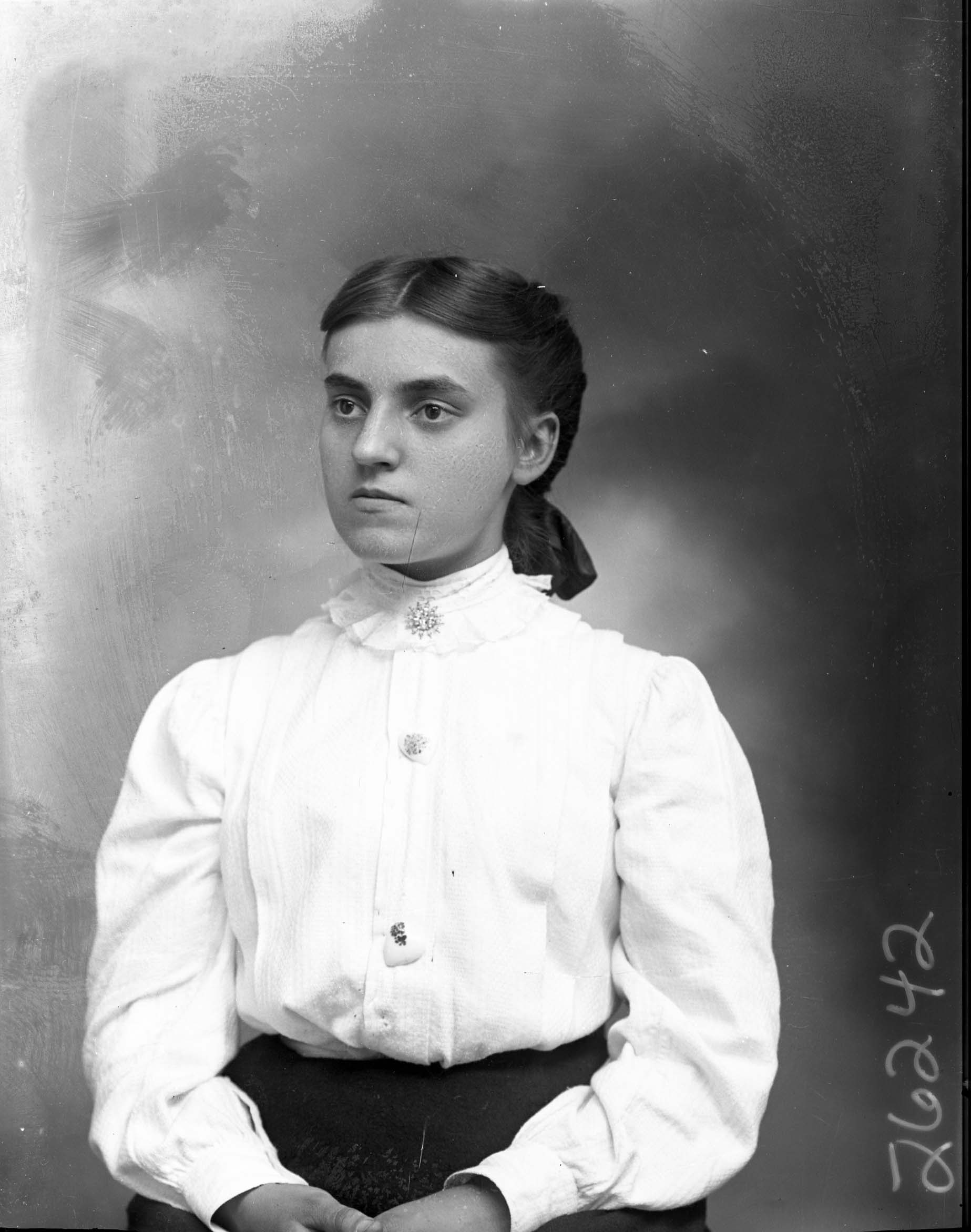 Portrait photograph of an unidentified young woman with her hair pulled back in a bow and wearing a pin on the collar of her blouse.