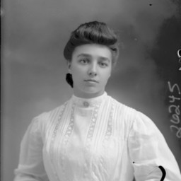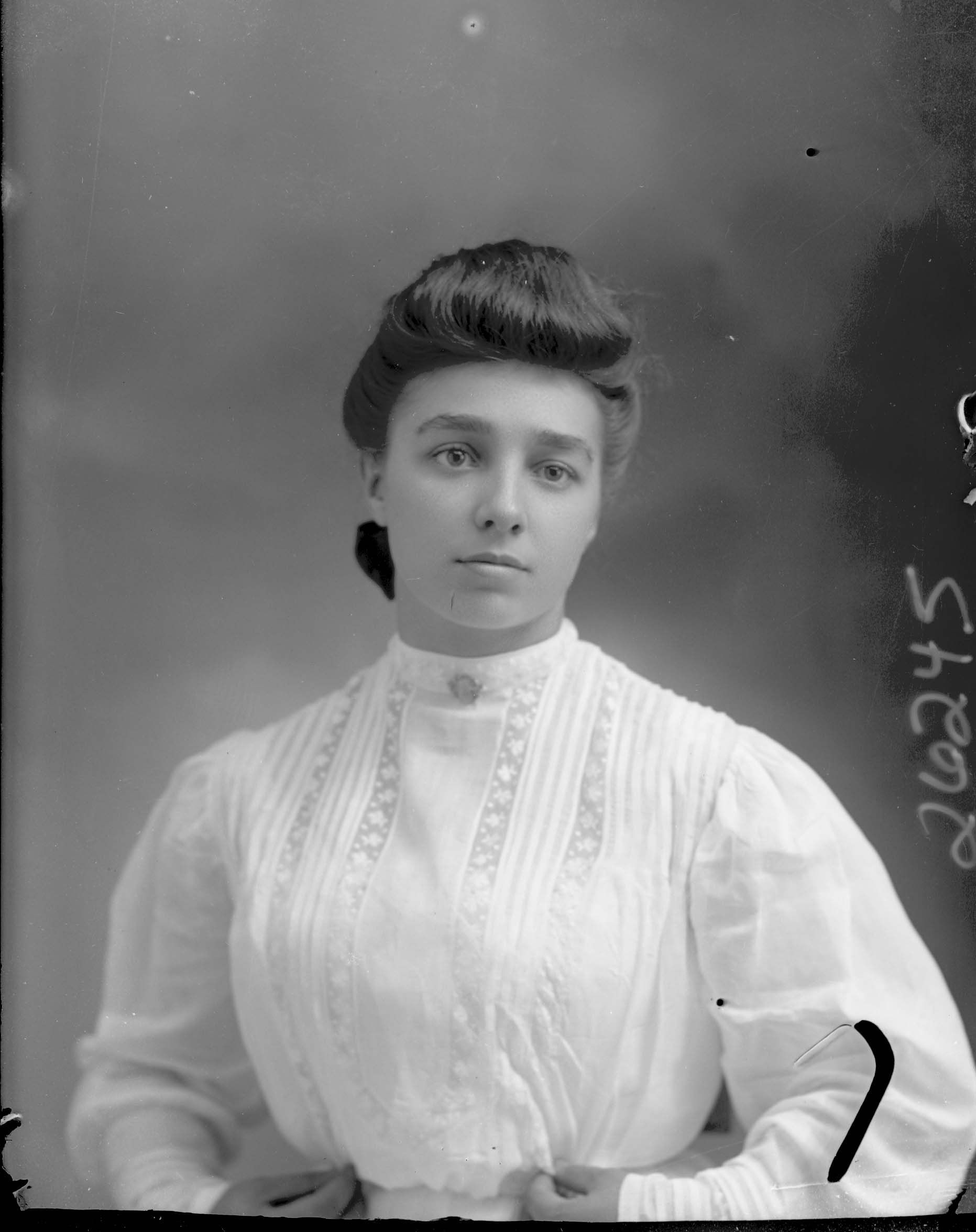 Portrait photograph of an unidentified young woman with her hair styled up and wearing a pin on the collar of her blouse.