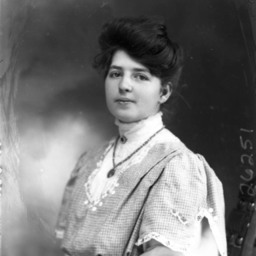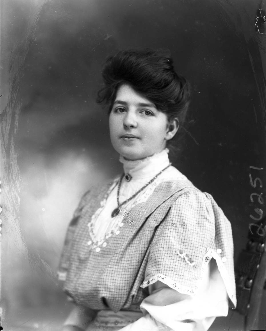 Portrait photograph of an unidentified young woman with her hair pulled up and wearing a pin and a necklace with her checkered dress.