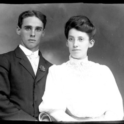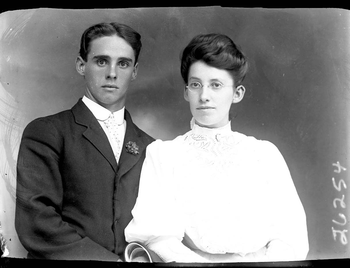 Portrait photograph of an unidentified young man in a polka-dotted tie and a boutonniere on his lapel posed beside an unidentified young woman with her hair pulled up and wearing glasses.
