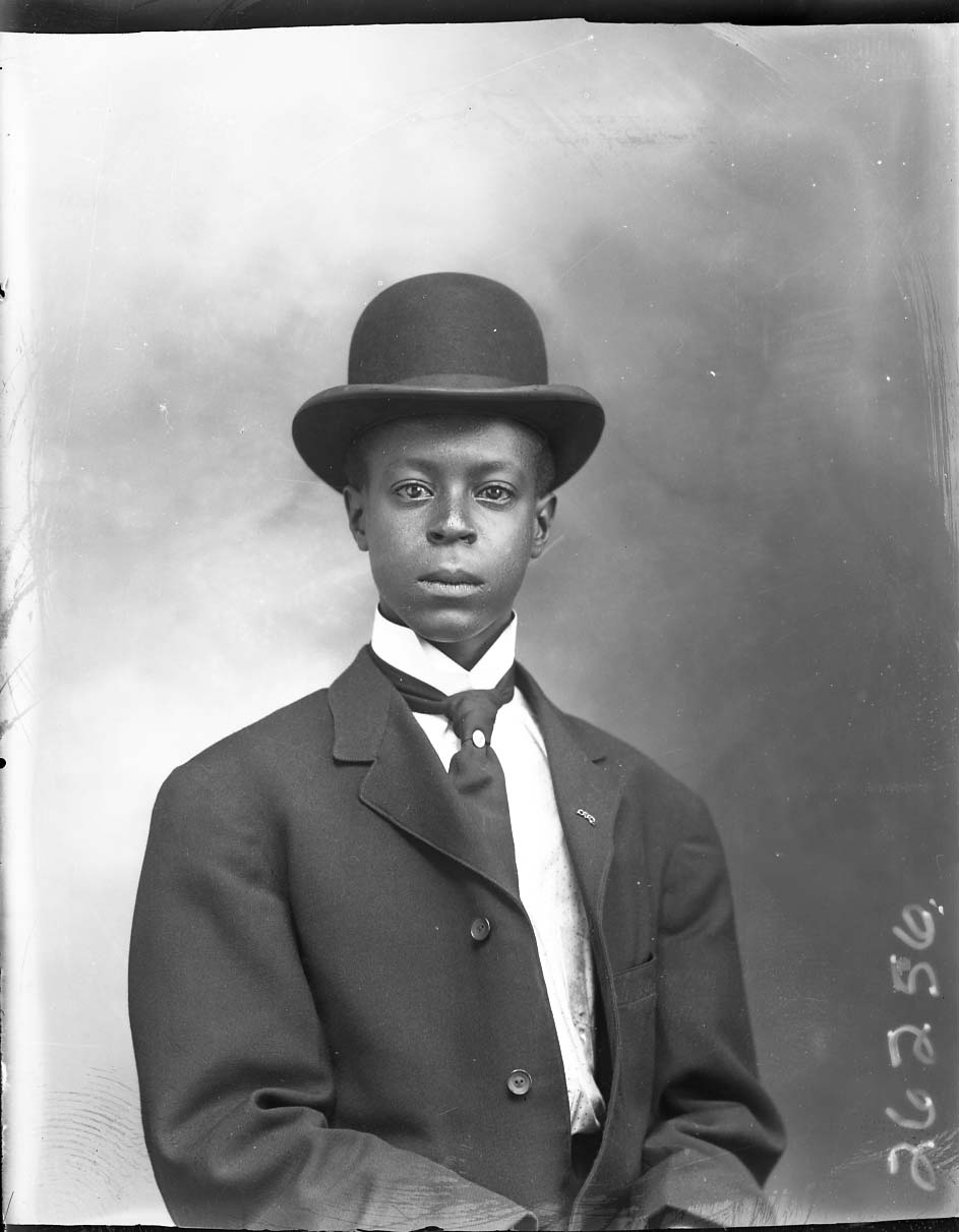 Portrait photograph of an unidentified young African American man wearing a suit and tie with a starched collar and bowler-styled hat.
