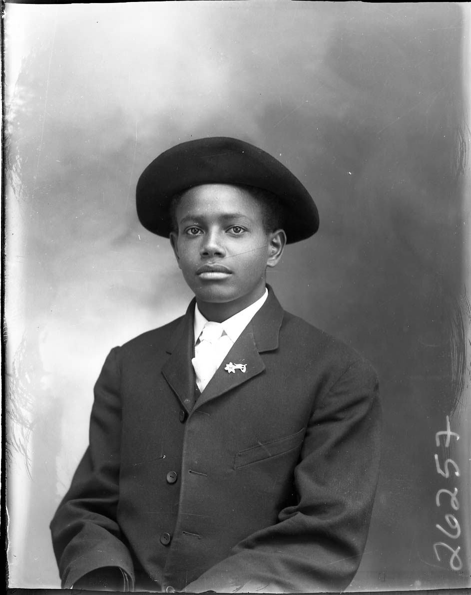 Portrait photograph of an unidentified young African American man, possibly teen-aged, wearing a hat and suit with a pin on the lapel.