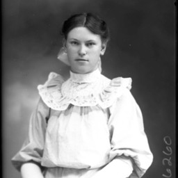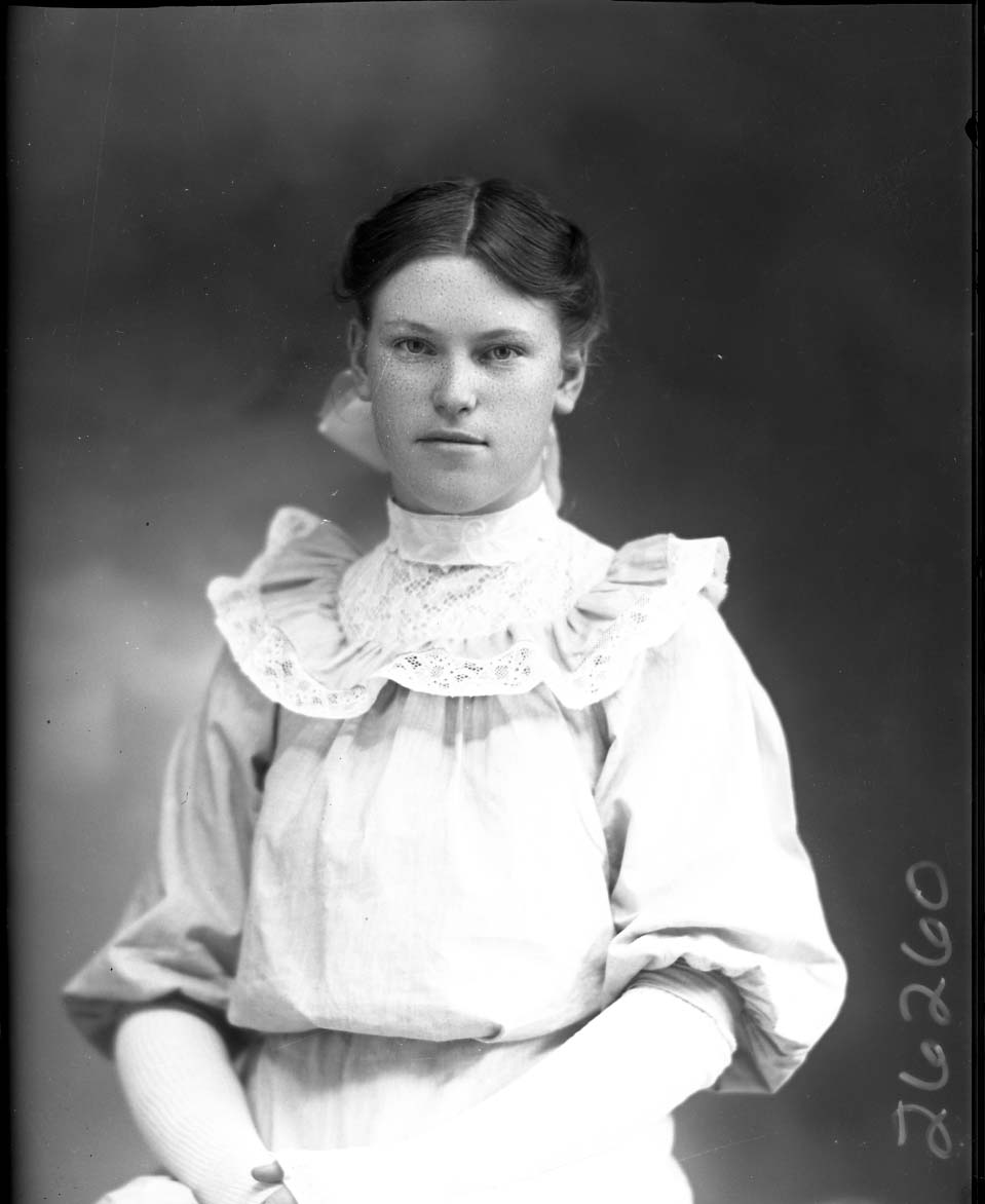 Unidentified young woman, possibly teen-aged, is wearing a bow in her hair and lace trim around the collar of her dress.