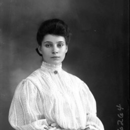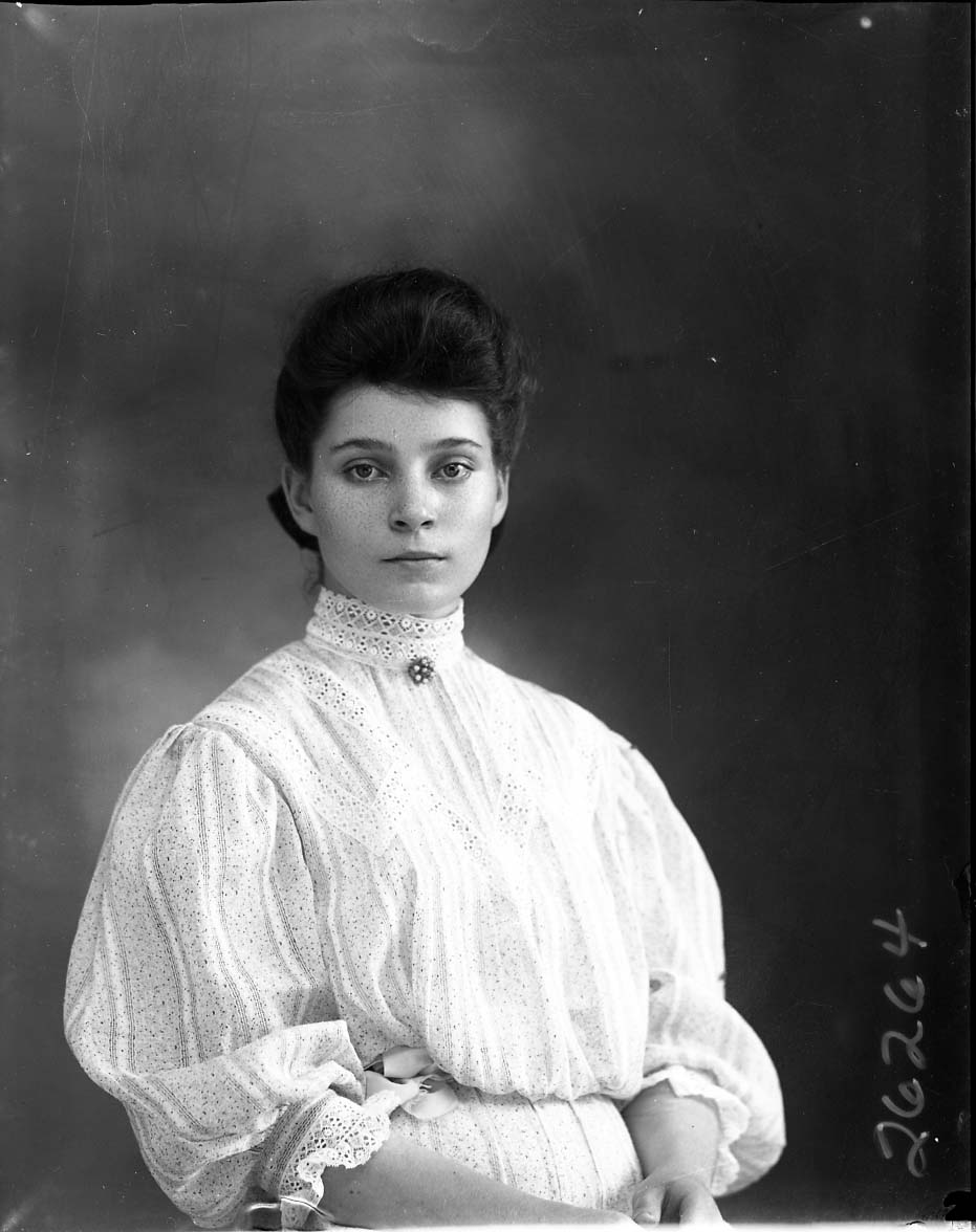 Portrait photograph of an unidentified woman with her hair pulled up and a pin on the collar of her dress.