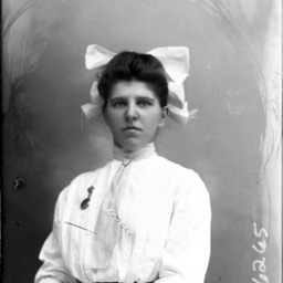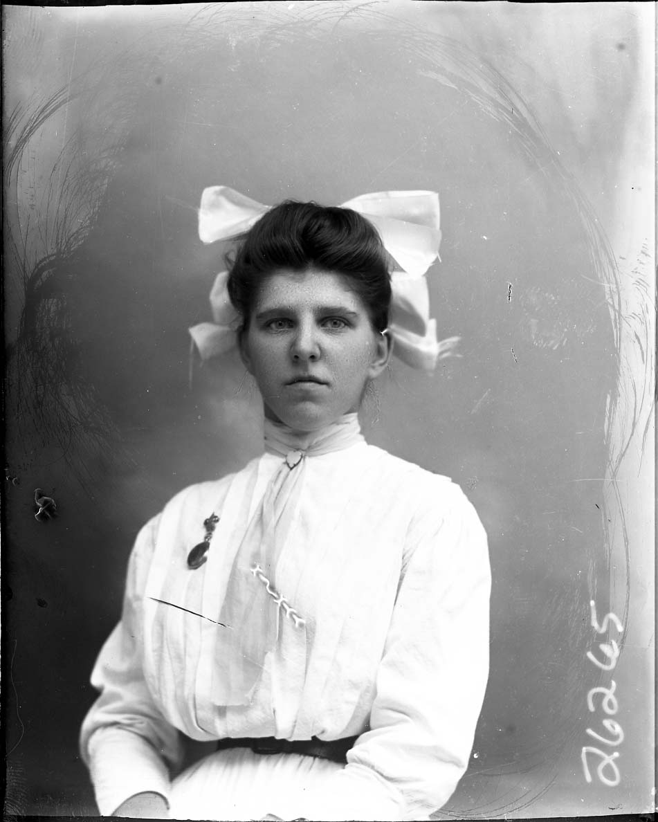Portrait photograph of an unidentified woman with bows in her hair and wearing a locket or pocket watch pinned to her dress.
