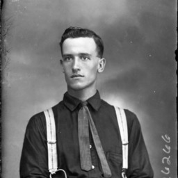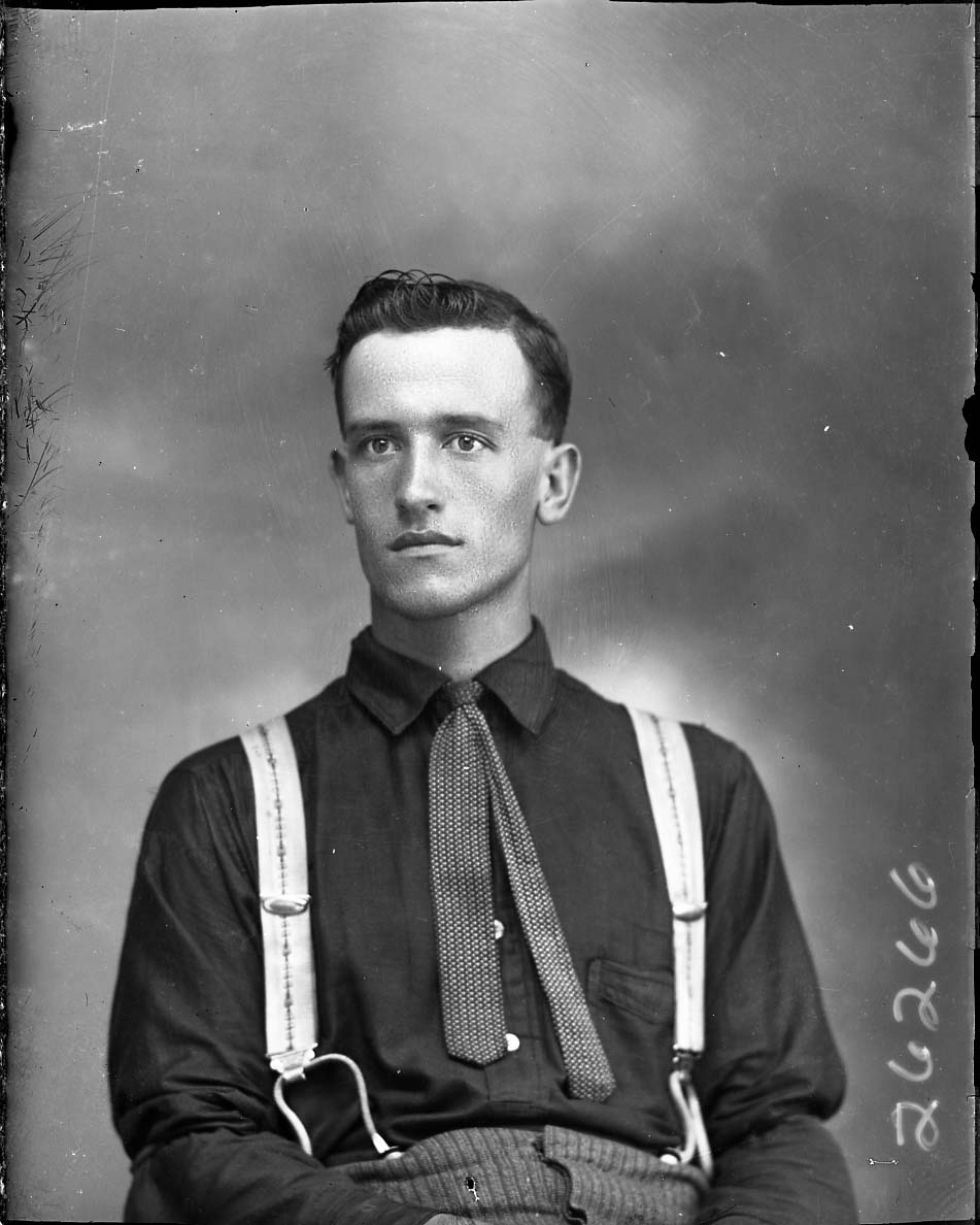Portrait photograph of an unidentified young man wearing a tie and suspenders.