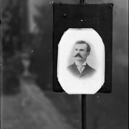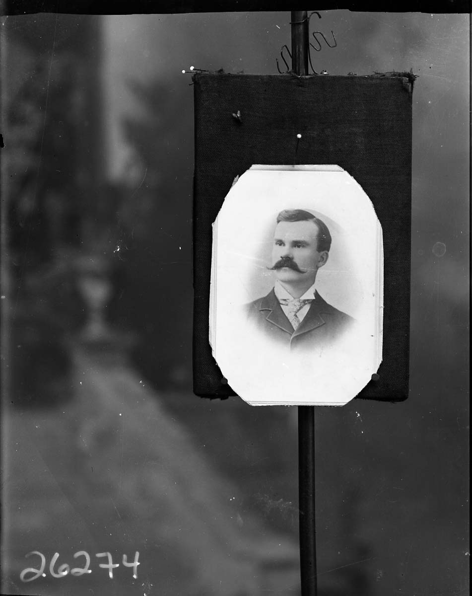 Photo of a photograph of an unidentified man with a mustache and wearing a suit and tie.