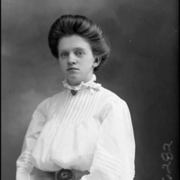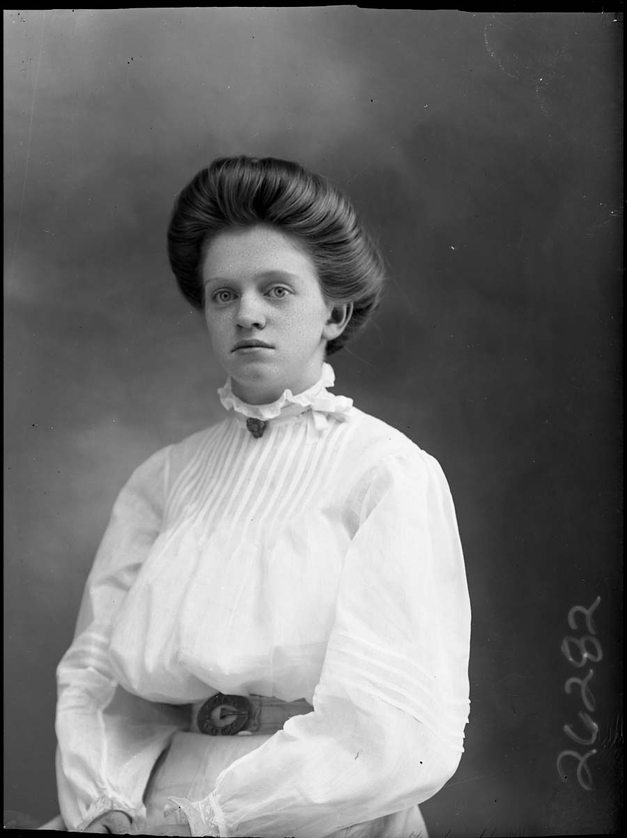 Portrait photograph of an unidentified woman with her hair styled back and wearing a pin on the collar of her blouse and a belt with a large buckle.