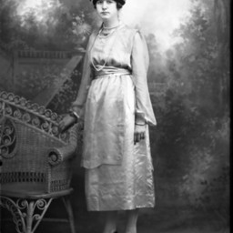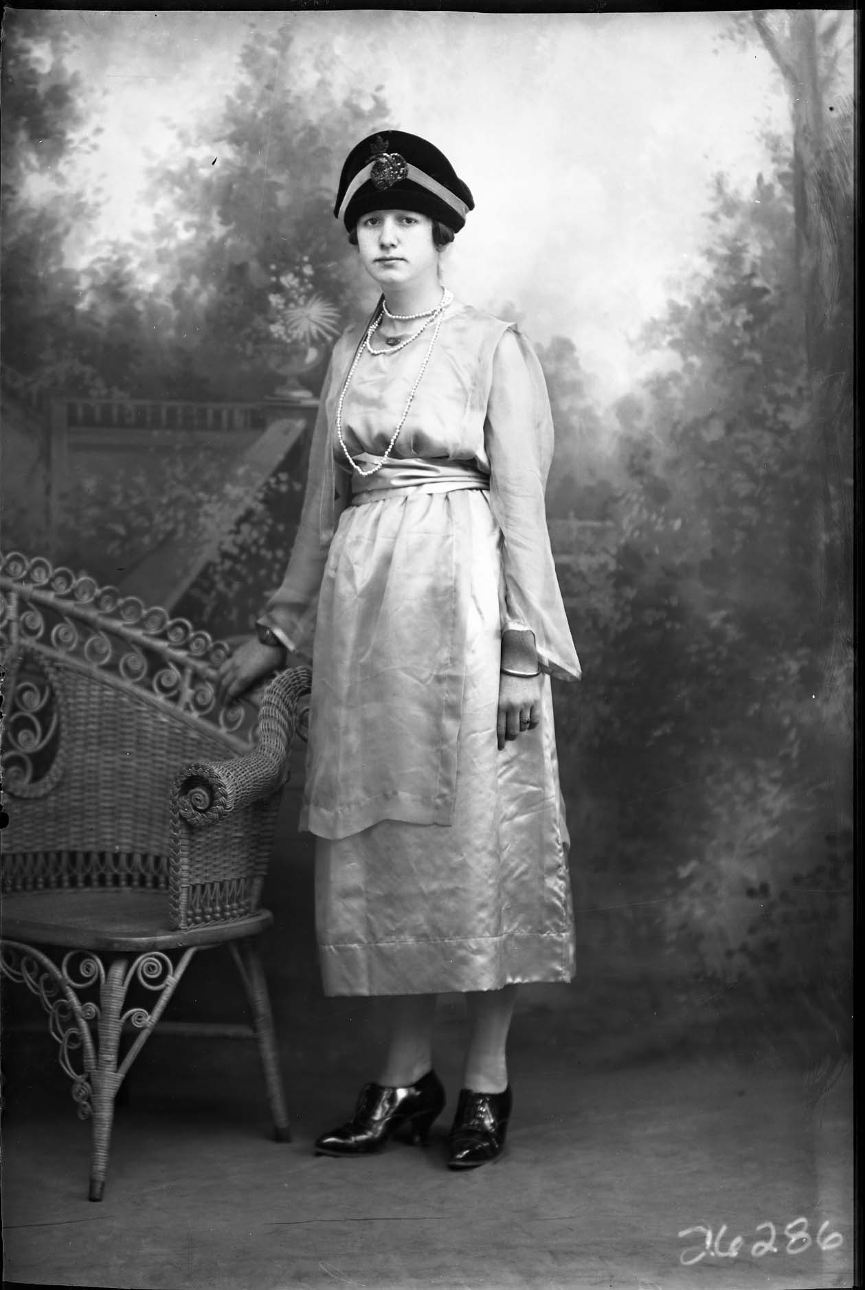 Unidentified woman in a hat and long-sleeved dress, is standing by a wicker chair.