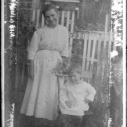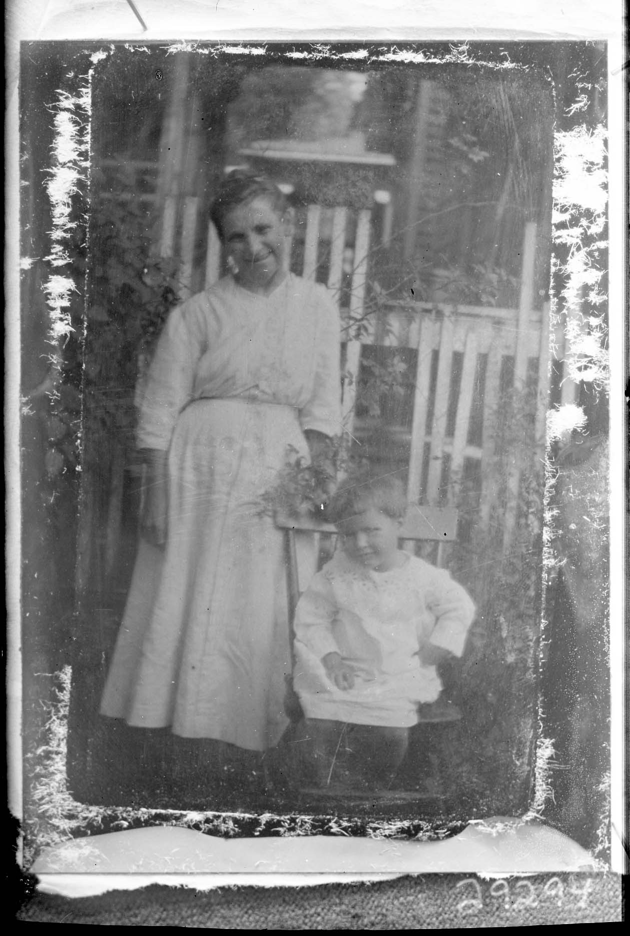 Photo of a photograph of an unidentified woman standing beside an unidentified young child. Both are in a yard outdoors.