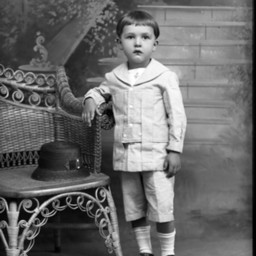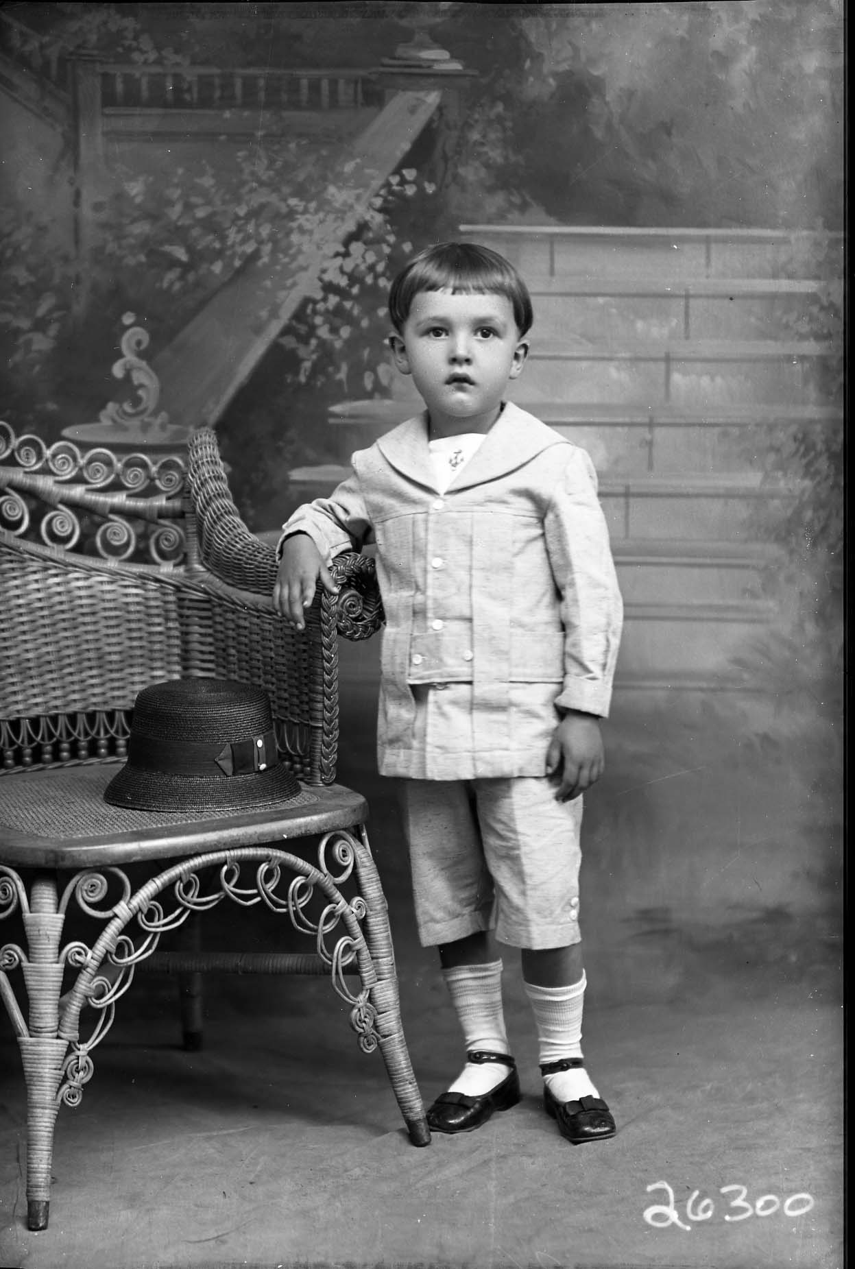 Unidentified young boy is standing by a wicker chair with a hat on it.