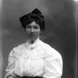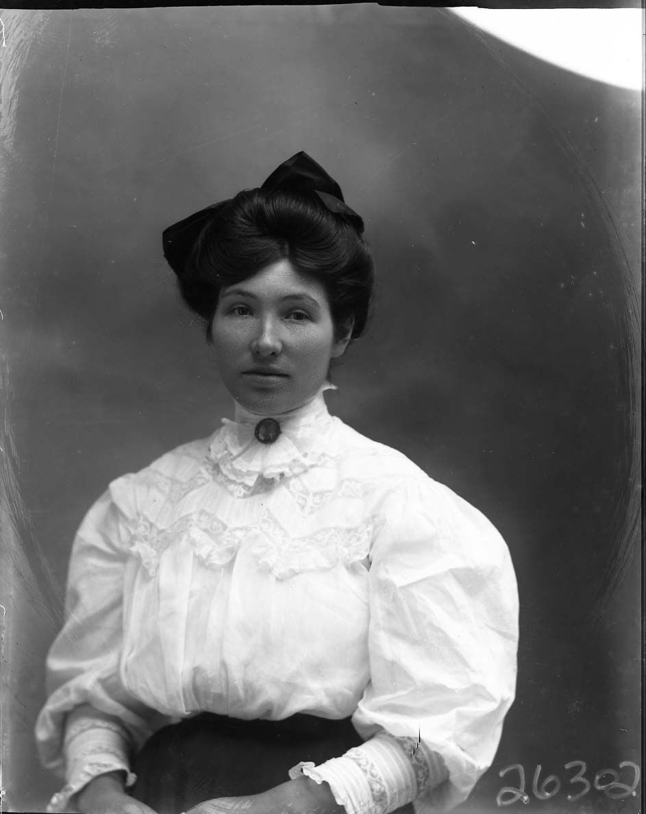 Portrait photograph of an unidentified woman with a bow in her styled hair and wearing a brooch at the collar of her blouse.