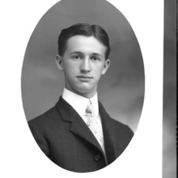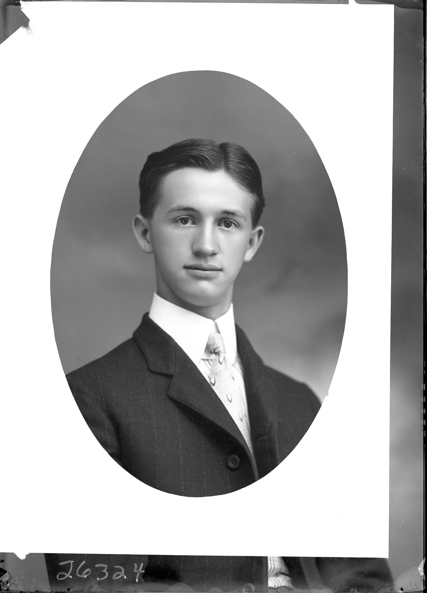 Photo of an oval-framed portrait photograph of an unidentified young man wearing a suit and tie with a starched collar.