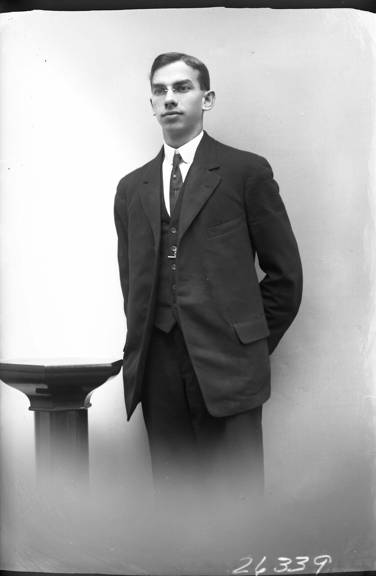 Unidentified man with pince-nez glasses and wearing a suit and tie, is standing by a studio prop with both hands behind his back.