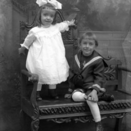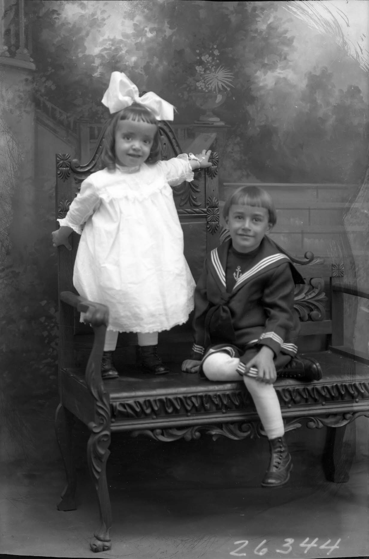 Two unidentified children, a girl with a large bow in her hair and a boy in a sailor-themed outfit, are posed together.