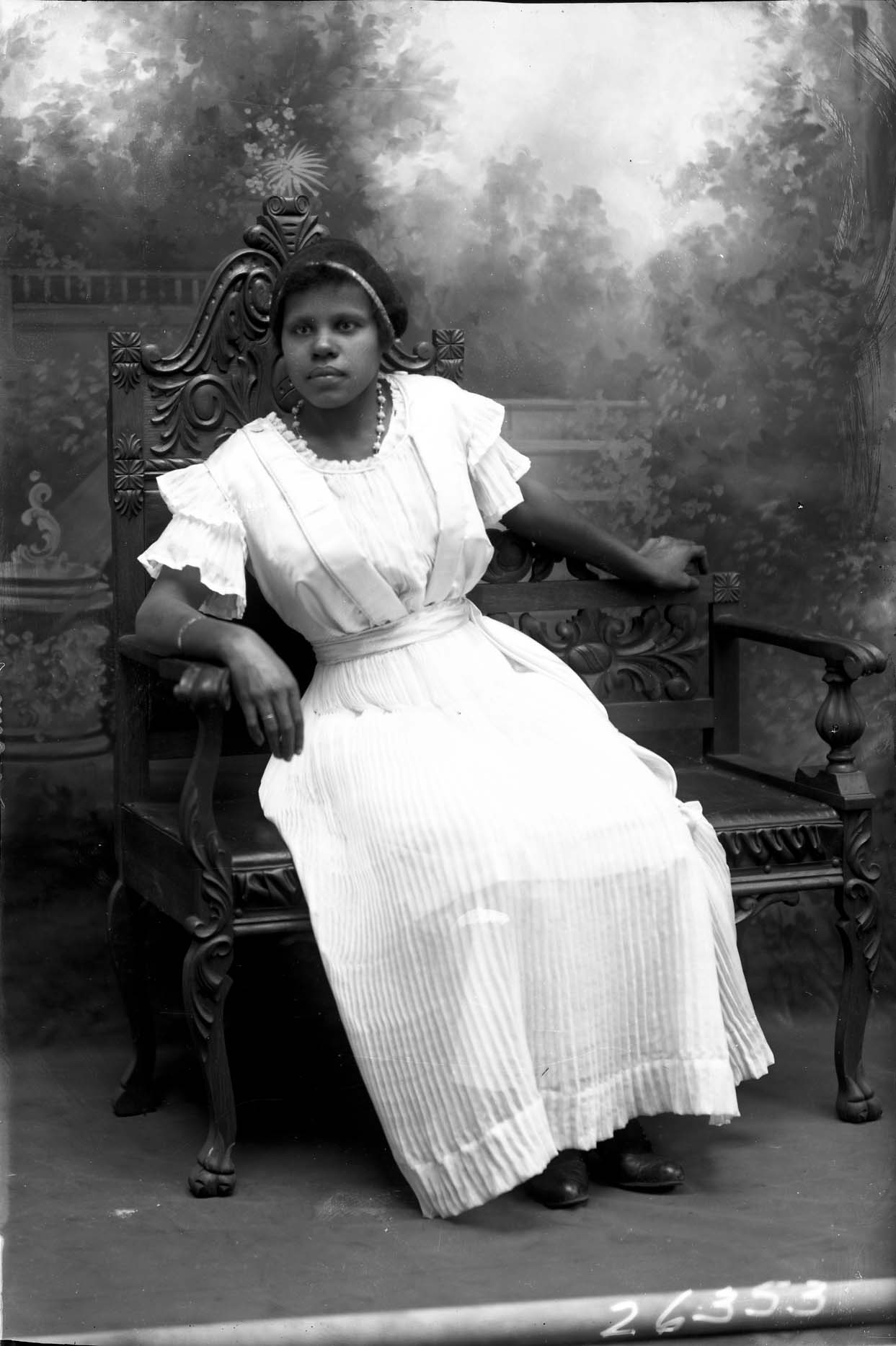 Unidentified African American woman is seated in a chair and wearing a necklace with her long dress.