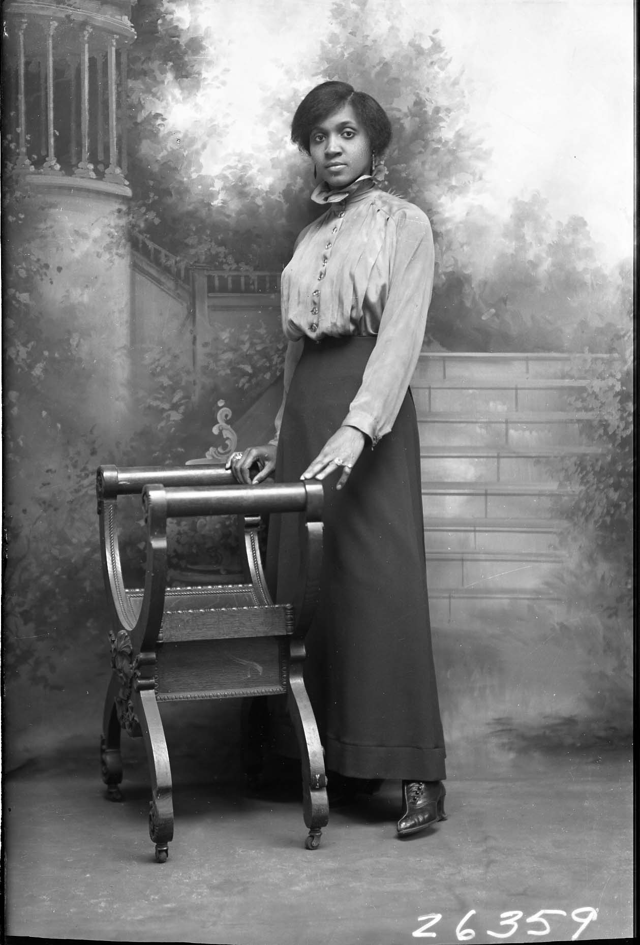 Unidentified young African American woman is standing by a chair and wearing a long skirt and blouse.