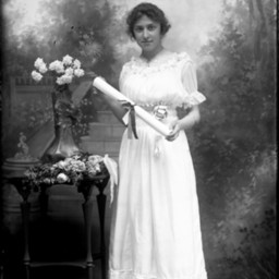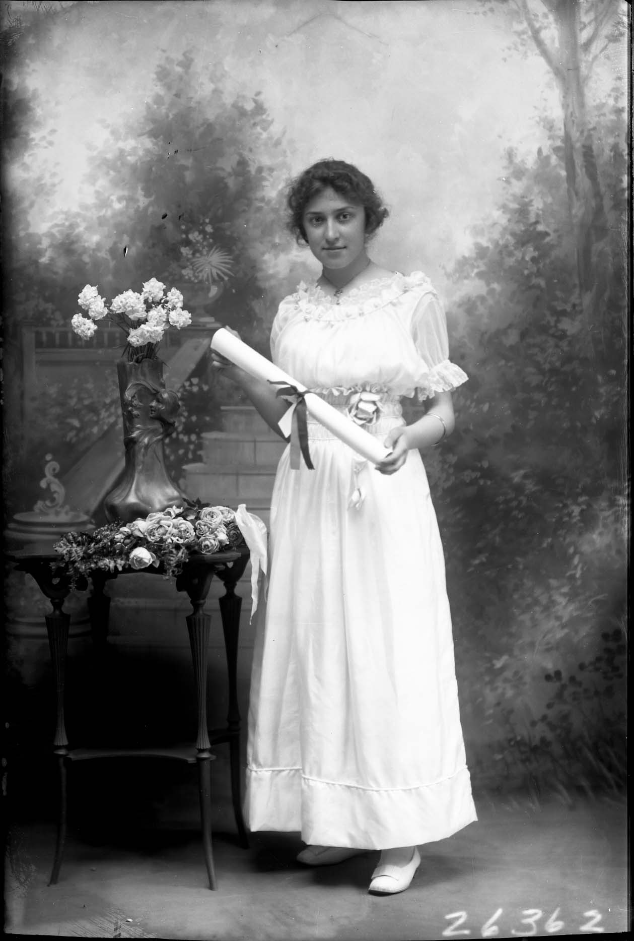 Unidentified young woman is standing beside a vase of flowers on a small table, and holding a rolled document, tied with a ribbon, in front of her.