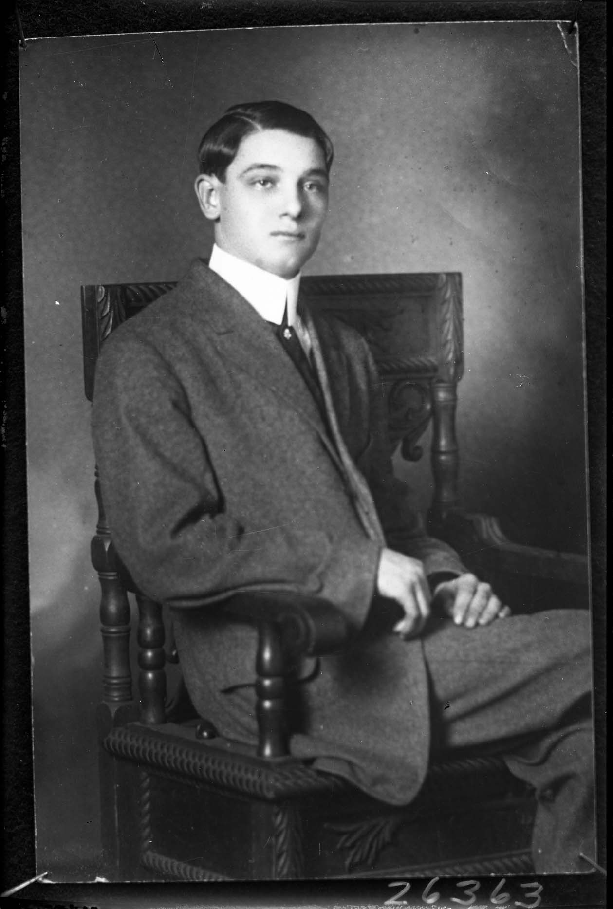Photo of a photograph of an unidentified young man seated on a chair and wearing a suit and tie with a starched collar.