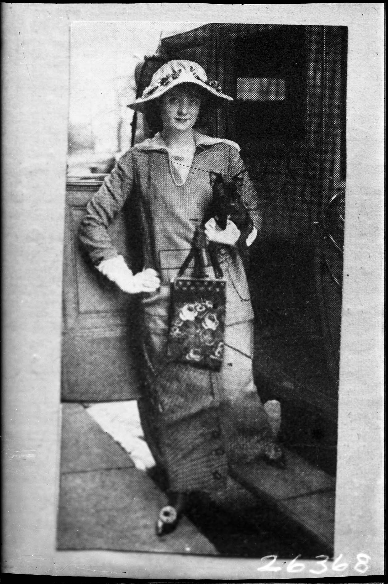 Photo of a photograph of an unidentified woman in a hat decorated with flowers.