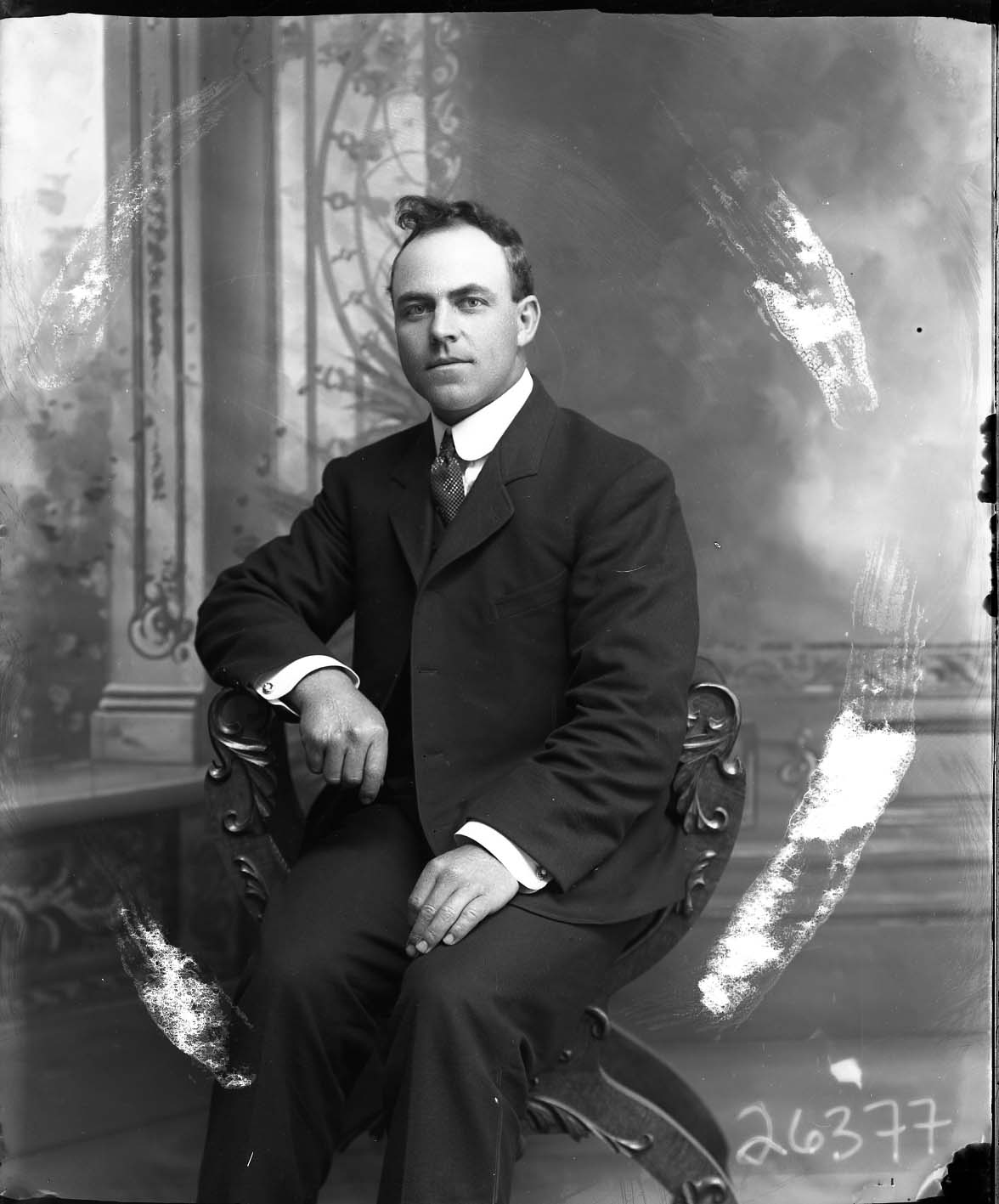 Unidentified man in a suit and tie with a starched collar is seated on a chair.
