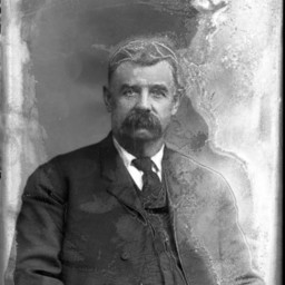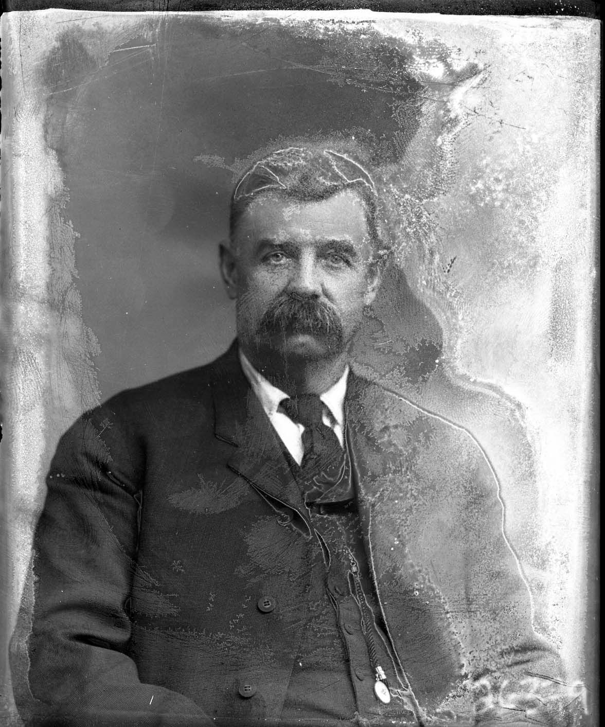 Portrait photograph of an unidentified man with a mustache and wearing a suit and tie.