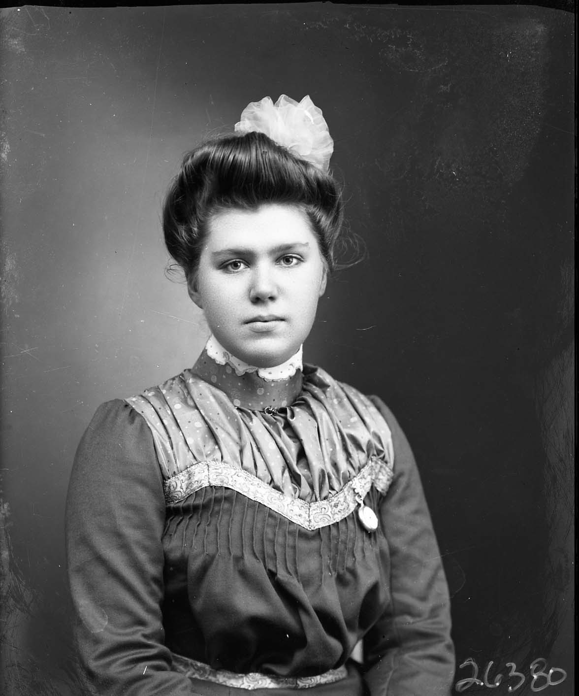 Portrait photograph of an unidentified woman with her hair pulled up and wearing a bow in it.