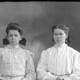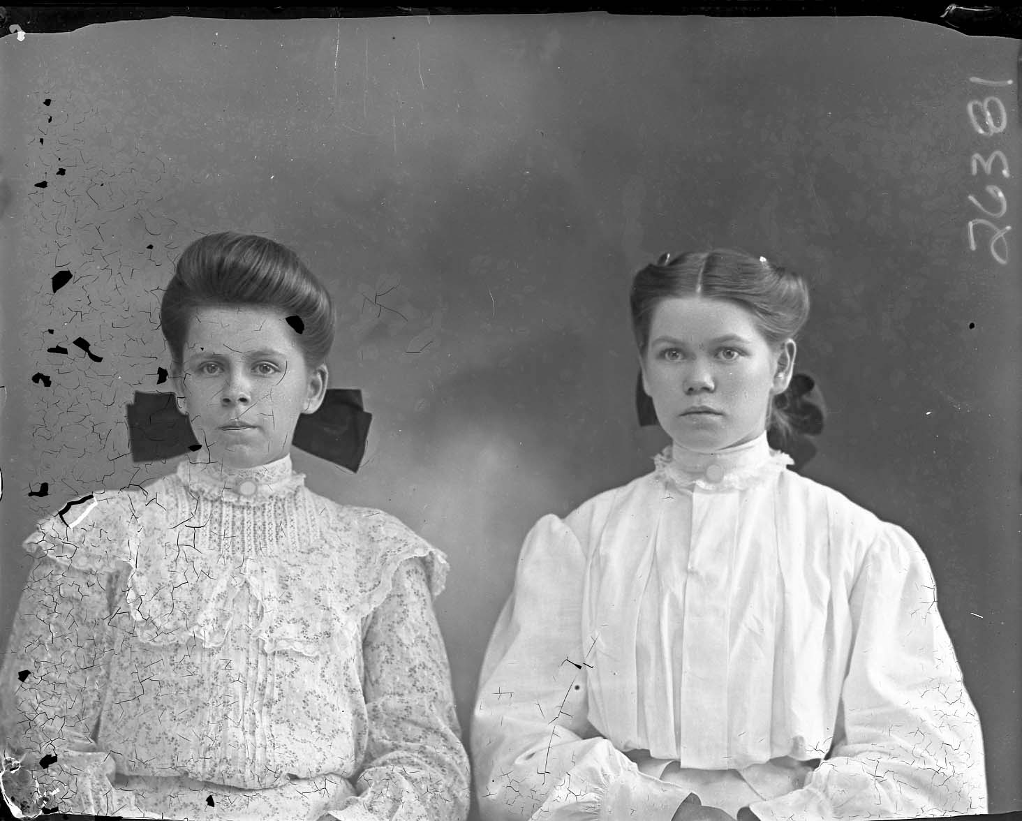 Portrait photograph of two young unidentified women posed together, both with bows in their hair.