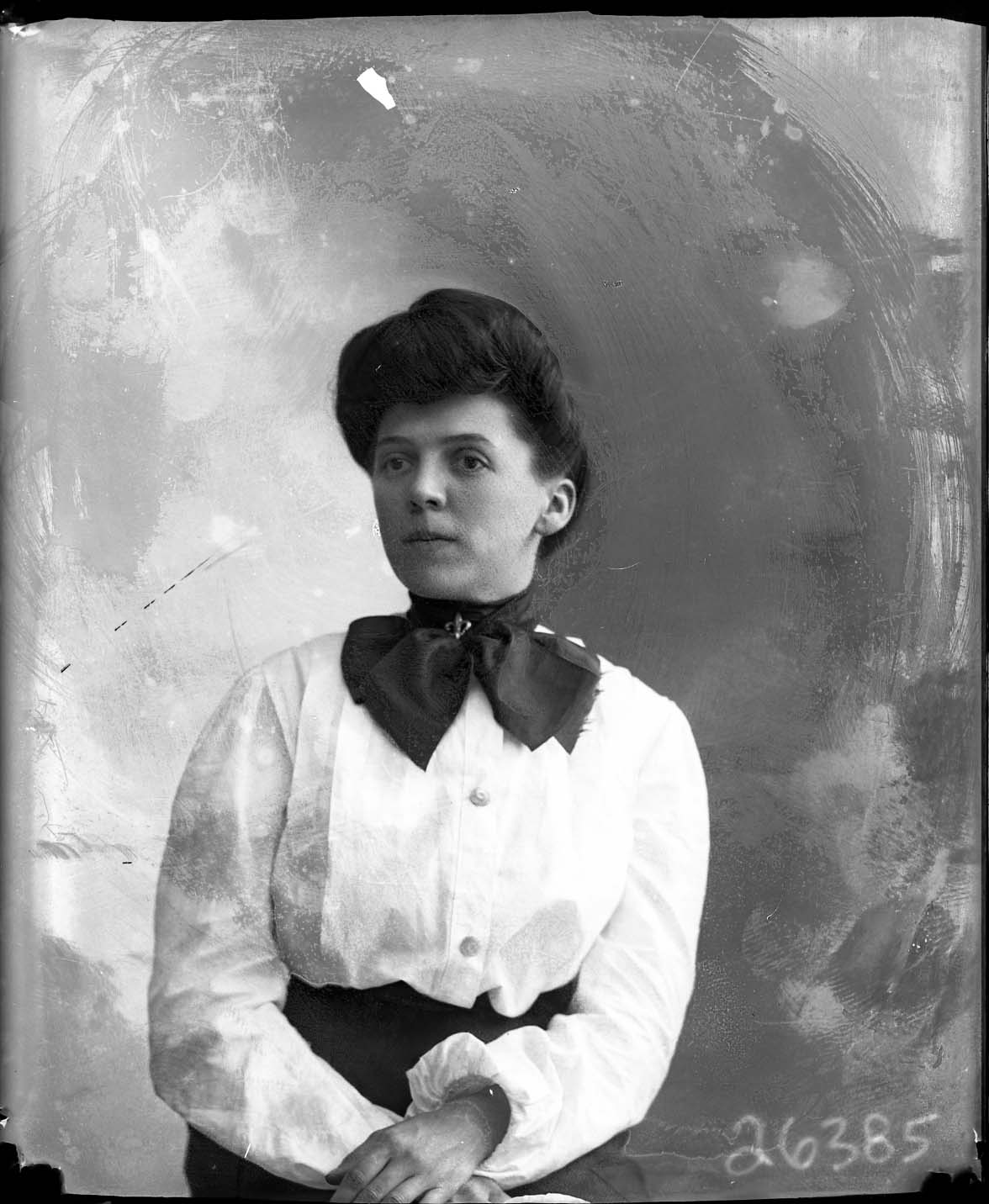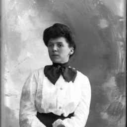 Portrait photograph of an unidentified woman wearing a bow tied at the neck of her blouse.