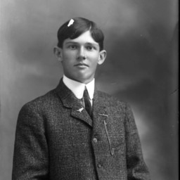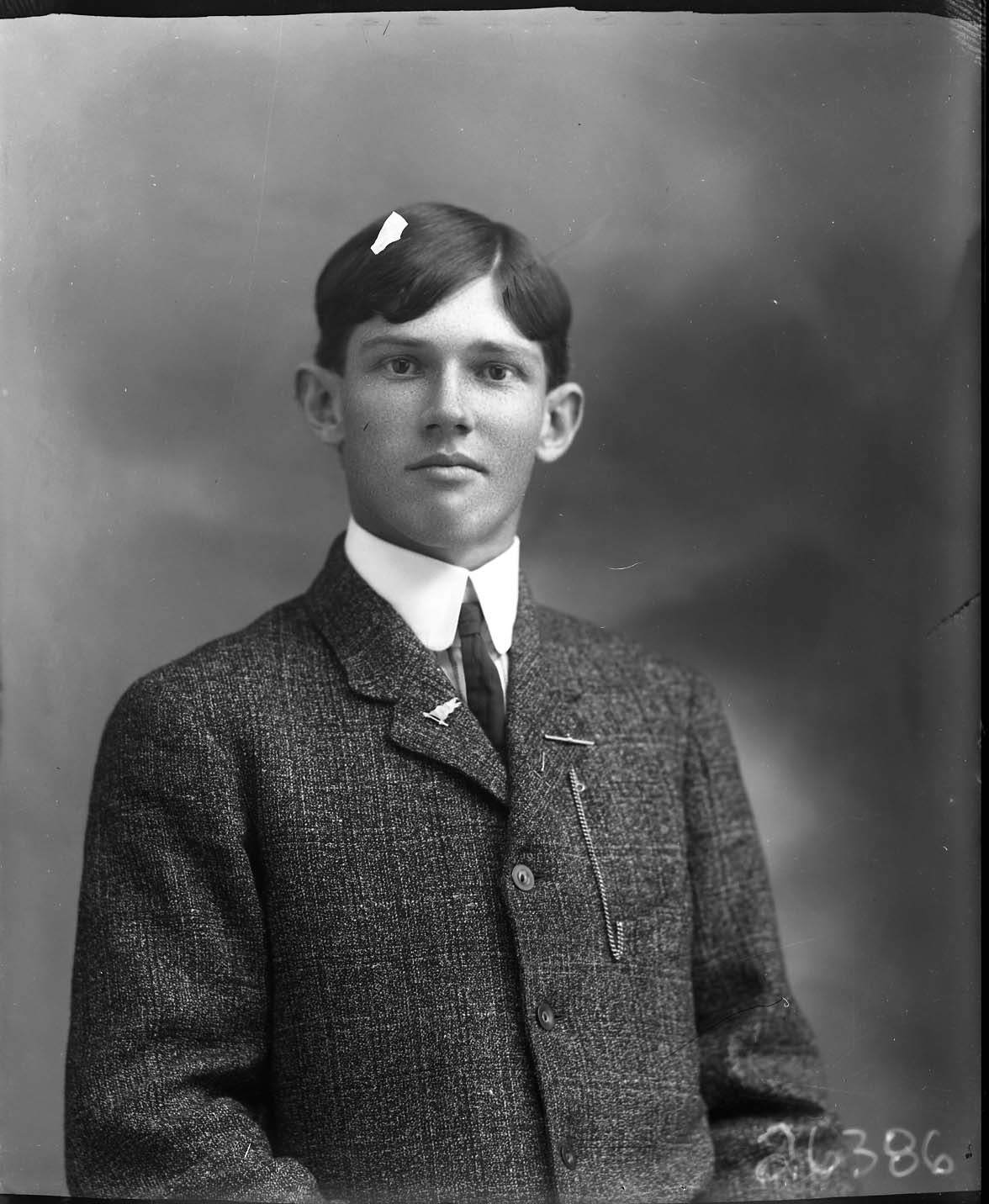 Portrait photograph of an unidentified young man wearing a suit and tie with a starched collar. A chain pinned to his lapel is visible hanging down to his breast pocket.
