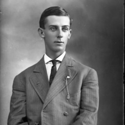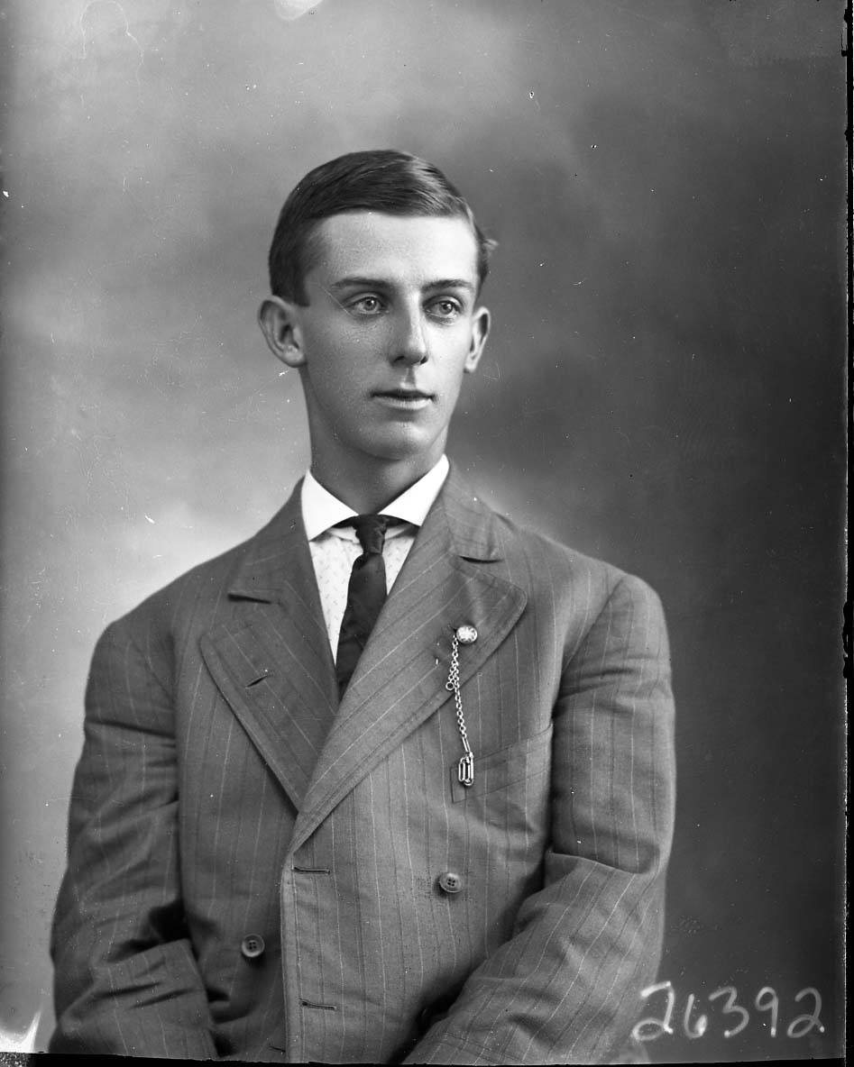 Portrait photograph of an unidentified young man wearing a striped suit and tie with a chain pinned to his lapel and hanging down to his breast pocket.