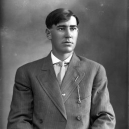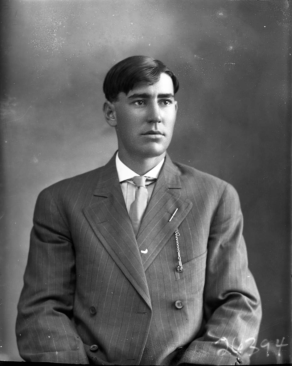 Portrait photograph of an unidentified young man wearing a suit and tie with a chain pinned to his lapel and hanging down to his breast pocket.