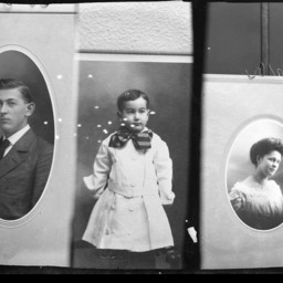 The photograph in the middle is of a child. The two images on the ends are both portrait photographs in oval frames, one of a man and the other of a woman.