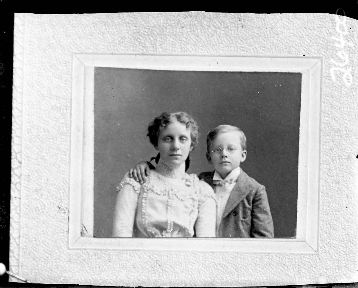 Photo of a framed portrait photograph of an unidentified boy in glasses with his arm around an older woman, probably his mother.