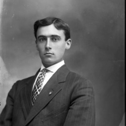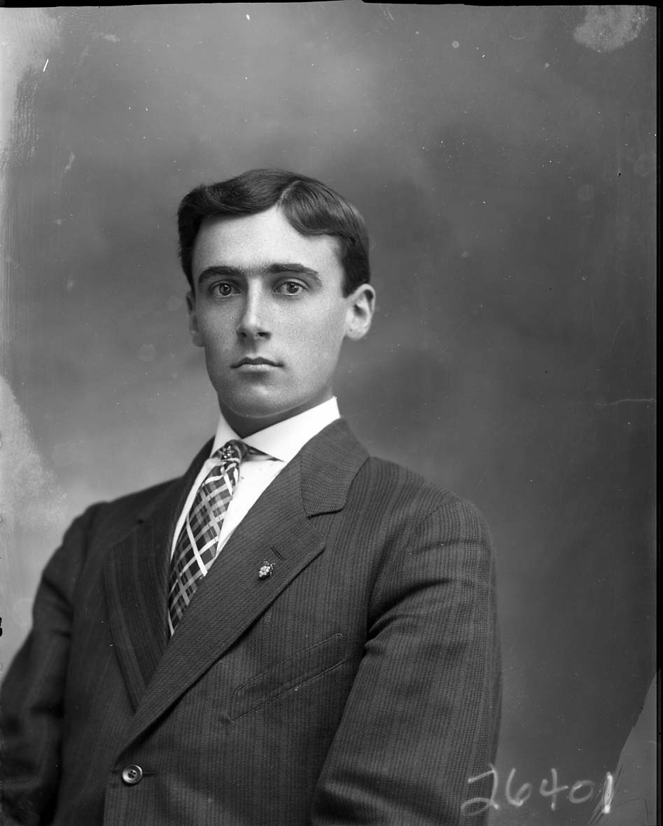 Portrait photograph of an unidentified young man wearing a suit and tie with a pin on his lapel.