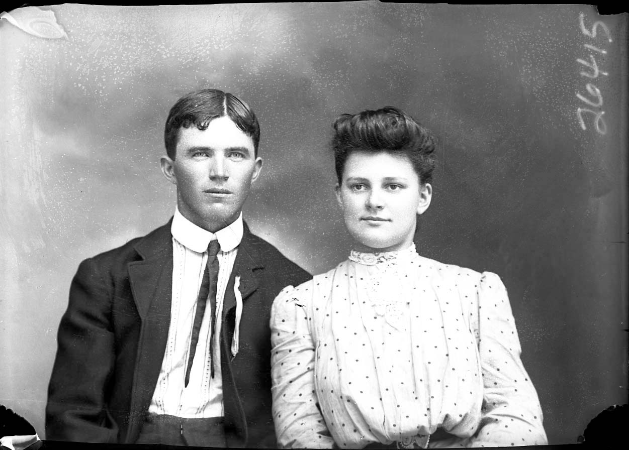 Portrait photograph of an unidentified young man wearing a ribbon on his suit jacket lapel. He is posed beside an unidentified woman with her hair styled up and wearing a polka-dotted blouse.