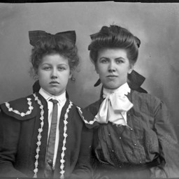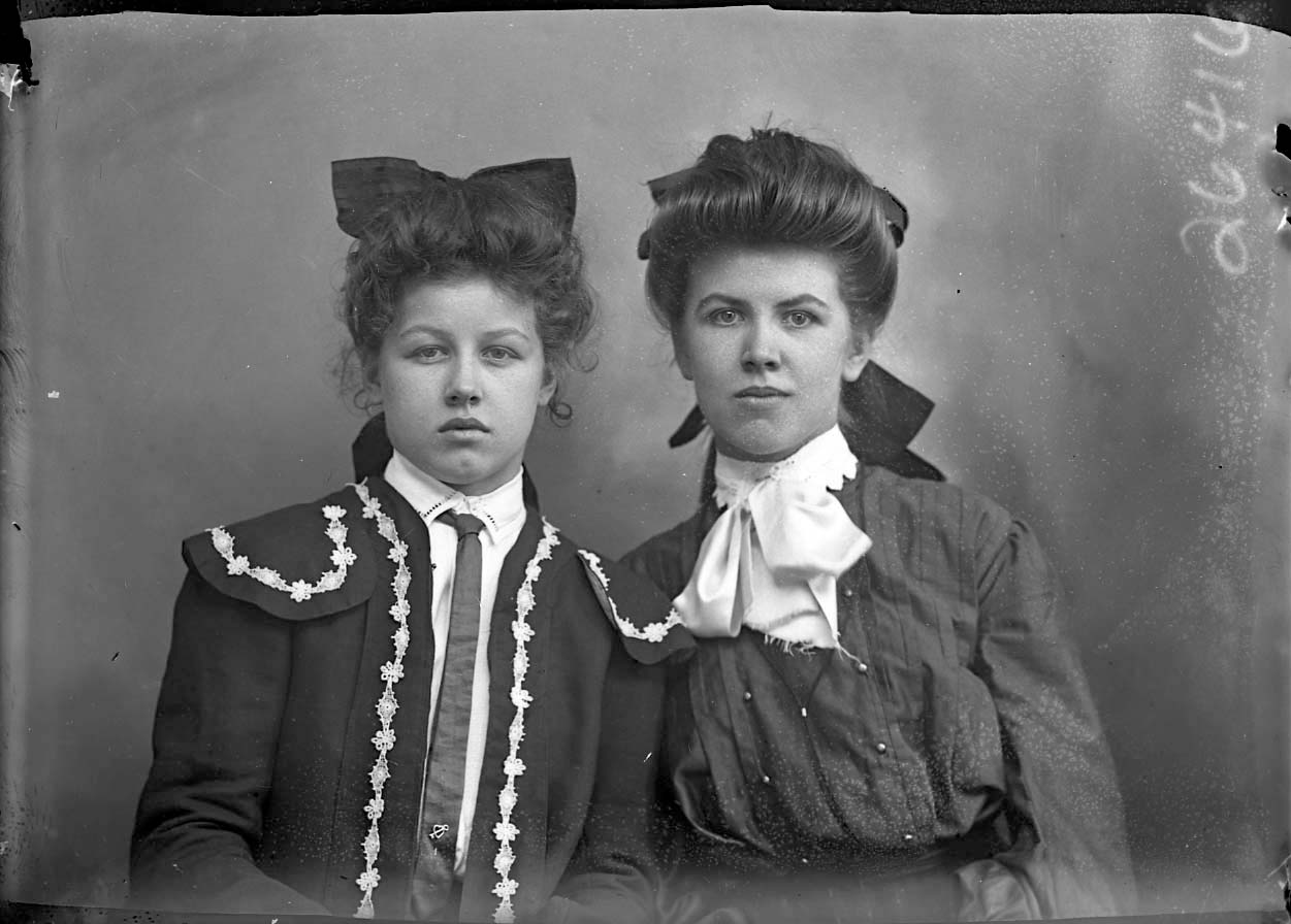 Portrait photograph of two unidentified women, both with bows in their styled hair.