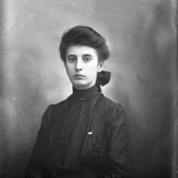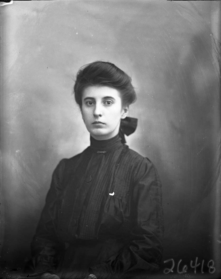 Portrait photograph of an unidentified young woman with a bow in her hair and wearing a dark-colored, long-sleeved dress.