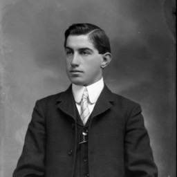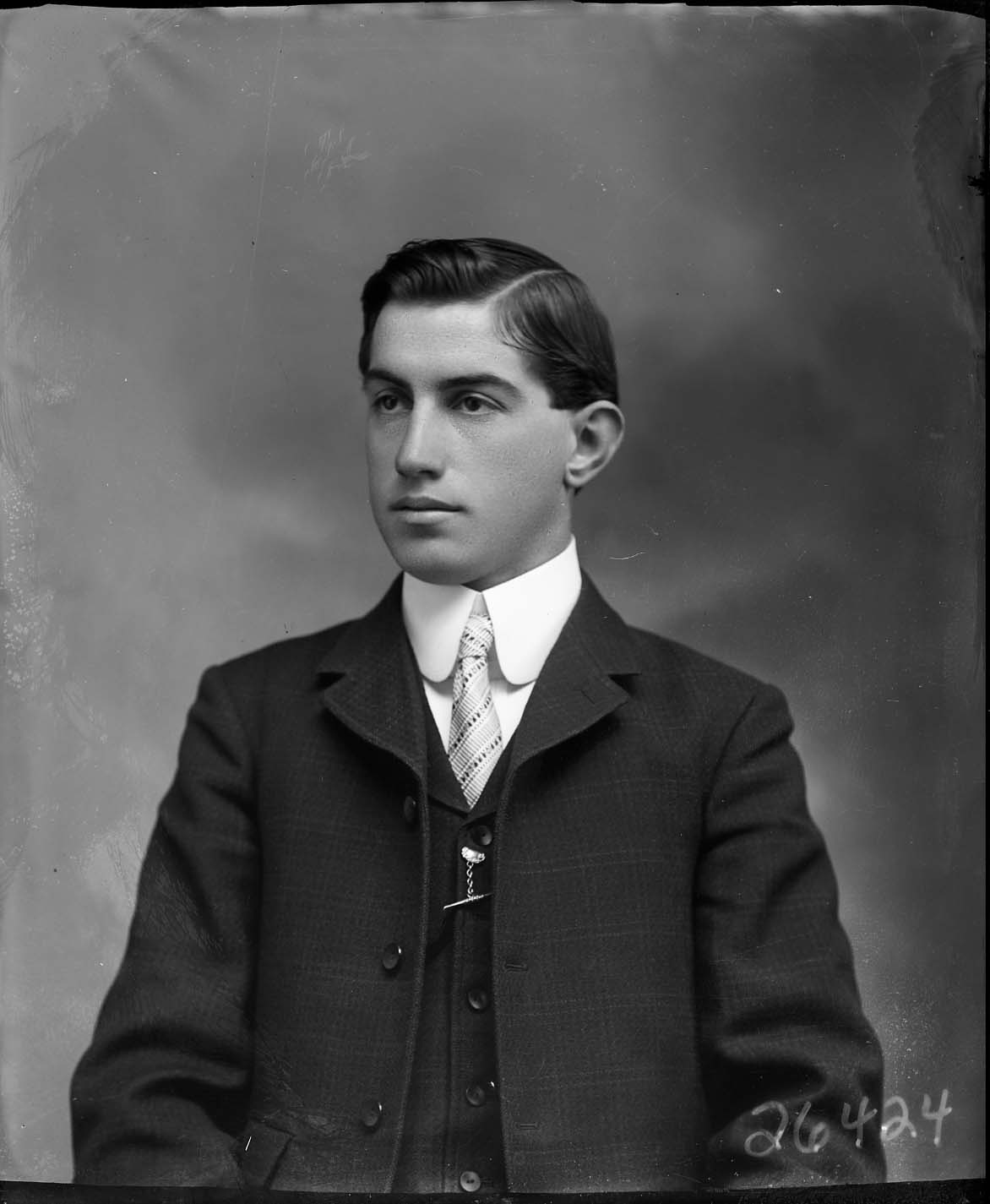Portrait photograph of an unidentified young man wearing a suit and tie with a high, starched collar.