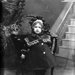 Unidentified young girl is standing in front of a chair and wearing a bonnet tied under her chin.