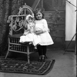 Unidentified young girl with short hair is standing by a wicker chair with her arm around a doll posed on it.