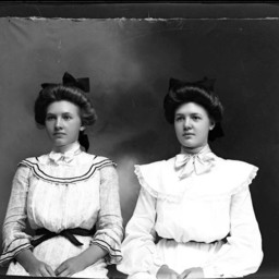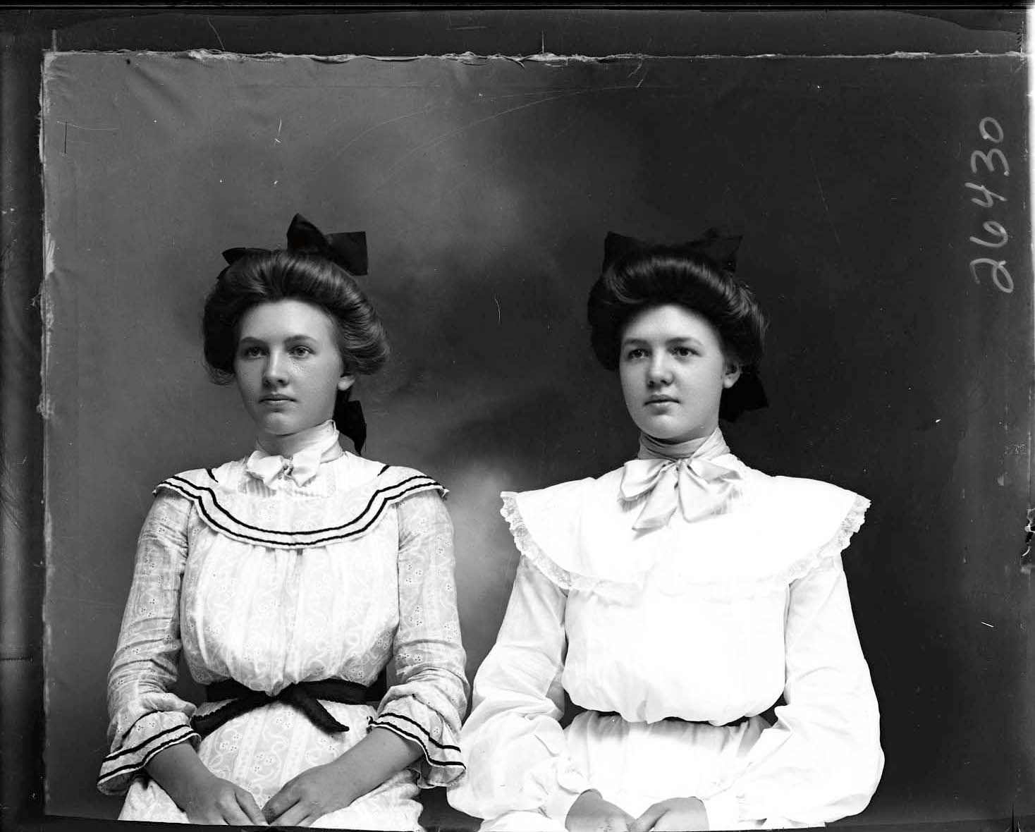 Photo of a photograph of two unidentified young women, both with bows in their hair and tied at the necks of their dresses.