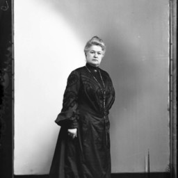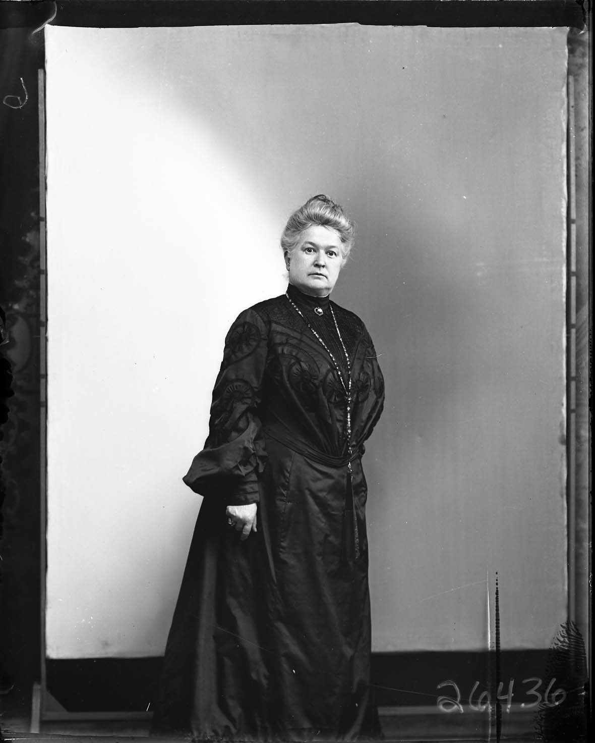 Unidentified older woman in a long dark-colored dress is standing with one hand behind her back.