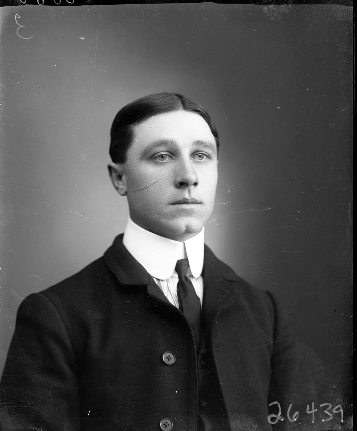 Portrait photograph of an unidentified man in a suit and tie with a high, starched collar.